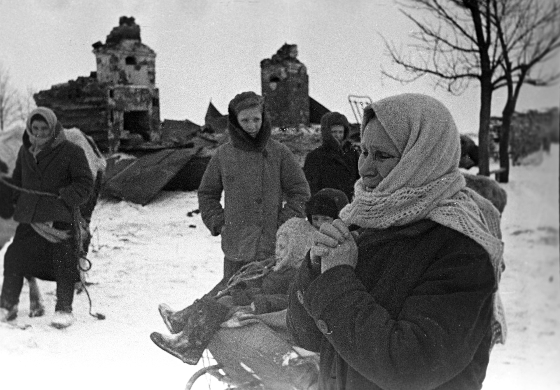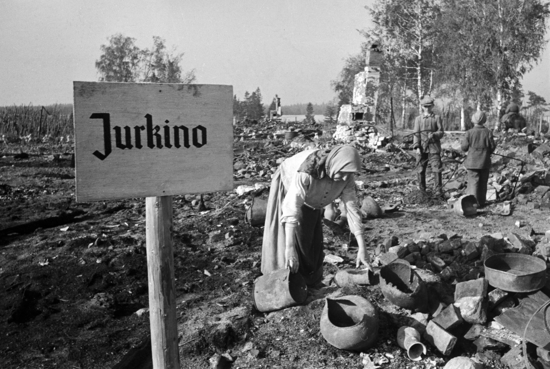 • Жители возвращаются в родное село Юркино Калининской области, освобождённое от немецкой оккупации. Женщина собирает уцелевшие остатки своего имущества на месте сгоревшей деревни