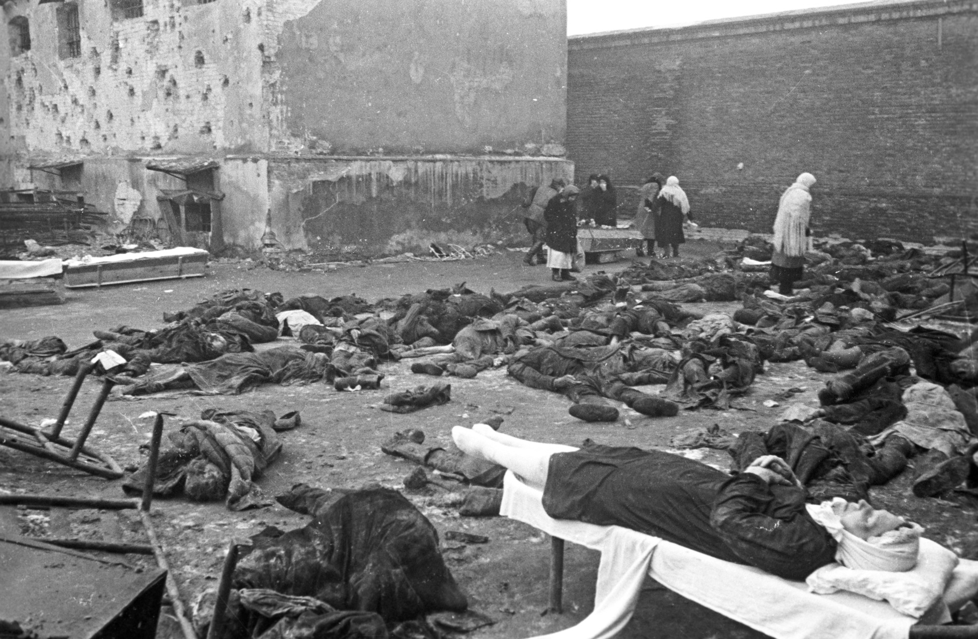 • Мирные жители, замученные и расстрелянные фашистами во дворе ростовской тюрьмы перед отступлением